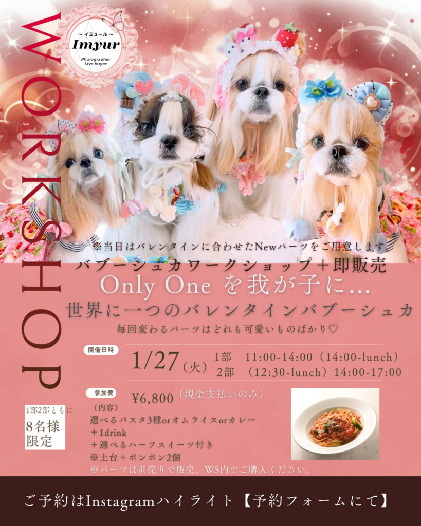 今回のテーマは「バレンタイン」✨ 当日、バレンタインに合わせたNewパーツをご用意します。毎回変わる可愛いパーツで、愛犬にぴったりな“Only One”のバブーシュカを作りましょう!
